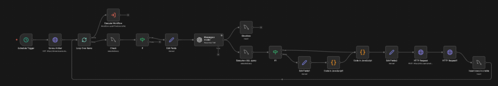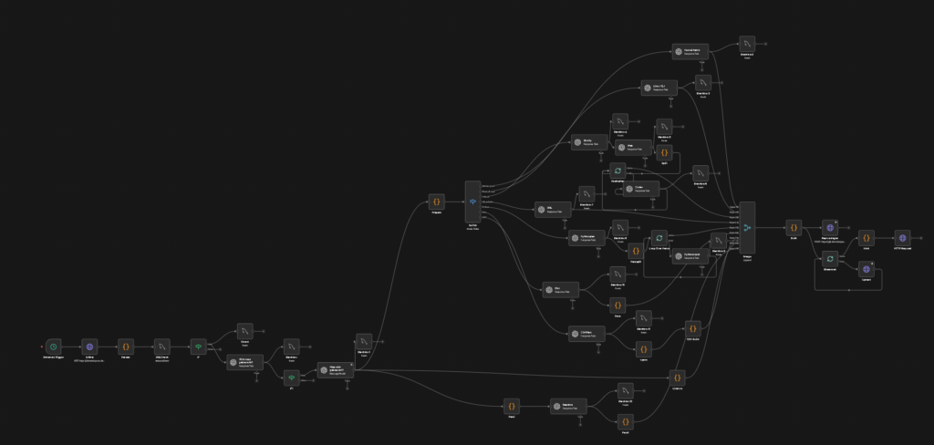 Das ganze sieht dann so aus in n8n – sry das die Nodes nicht betitelt sind. Das ganze wie man es hier sieht läuft nun seit etwa einer Woche und bisher bin ich mit dem Output daraus zufrieden. Nun heißt es eben abwarten, ob es auch zum gewünschten Themenwechsel mal kommen wird. Dazu sind auch die KI Nodes im Hauptworkflow optimiert – auf einen Themenfortschritt.