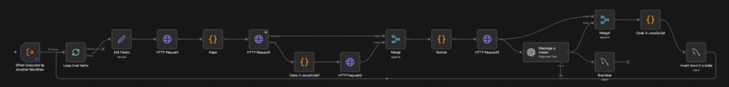 Das ist dann der n8n Workflow für Projekte die man auf Github vorfindet. In einer Datenbank werden die ganzen Projekte gespeichert und ein Auslöser Workflow triggert dann diesen Workflow, welcher dann die ganzen Github Projekte einzeln abarbeitet.